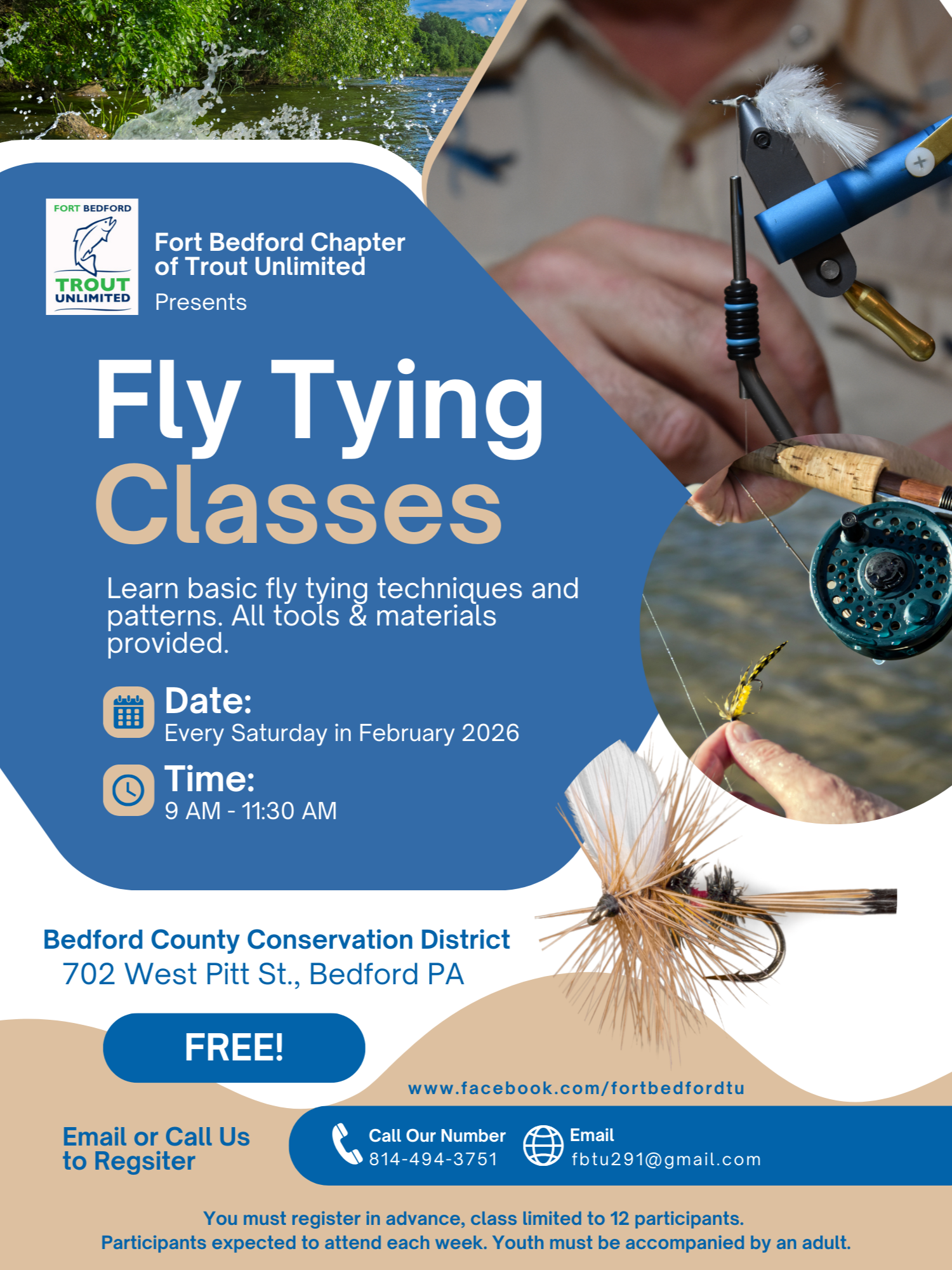 Learn basic fly tying techniques and patterns. Cost is free. All tools & materials are provided. You must register in advance. Classes progress in difficulty and technique each week.
